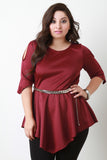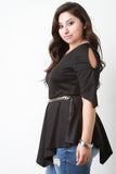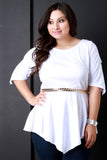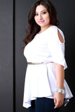 This cutesy plus size top features a cold shoulder design, elbow sleeves, boat neckline, peplum detail, and includes a chain belt. Accessories sold separately. Made in U.S.A. 95% Polyester, 5% Spandex.
