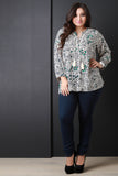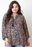 This peasant-style plus size top features a lightweight fabric with floral prints throughout, tassel lace up detail at neckline, long cinched sleeves, and loose fit. Accessories sold separately. 100% Rayon.