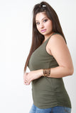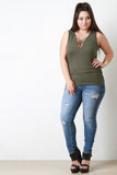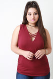This plus size top features a v-neckline with crisscross caged design, sleeveless, stretchy sculpture fit, and side ruched hem. Accessories sold separately. Made in U.S.A. 90% Polyester, 10% Spandex.