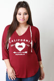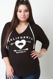 This plus size hoodie top features a v-neckline, drawstring d�cor, soft jersey knit fabrication, and California Republic screen print at front. Accessories sold separately. Made in U.S.A. 88% Rayon, 12% Polyester. Contrast: 97% Rayon, 3% Spandex.