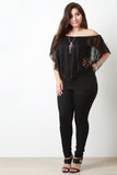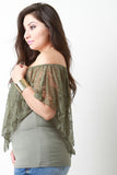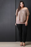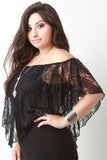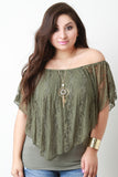 This trendy plus size top features an asymmetrical hem patterned lace overlay with jersey underlay, off the shoulder neckline, and includes a charm necklace. Made in U.S.A. Self: 92% Nylon, 8% Spandex. Contrast: 97% Rayon, 3% Spandex.