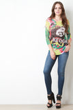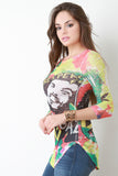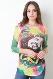 This vibrant tee features a soft knit fabric, "Make Peace For Reggae" graphic print, three quarter sleeves, and round neckline. Accessories sold separately. Made in U.S.A. 100% Polyester.