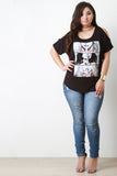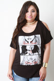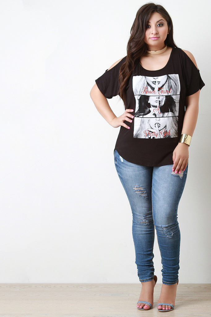 This plus size tee features a jersey knit fabric, "Never Trust A Pretty Girl" graphic print, cold shoulder, and short sleeves. Finished with a slightly rounded hemline. Accessories sold separately. Made in U.S.A. 97% Rayon, 3% Spandex.