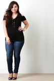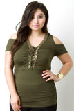 This plus size top features a jersey knit fabric, eyelet trimmed lace up v-neckline, cold shoulder and short sleeves. Finished with a rounded hemline and ruched sides. Accessories sold separately. Made in U.S.A. 97% Rayon, 3% Spandex.
