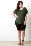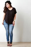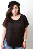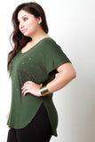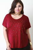 This plus size tee features a jersey knit fabric, grommets and crystals design at front, scoop neckline, and short dolman sleeves. Finished with a rounded hemline. Accessories sold separately. Made in U.S.A. 97% Rayon, 3% Spandex.