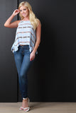 This sleeveless top features a v-neckline with lace trimming accent, spaghetti shoulder straps to a self-tie keyhole back, sharkbite hem, ruffle sides, and horizontal tribal striped pattern on texture knit fabrication. Accessories sold separately. 100% Rayon.