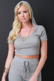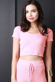 This top features a thermal knit fabrication round neck with a hoodie back, short sleeves, and a crop hemline. Accessories sold separately. Made in U.S.A. 95% Rayon, 5% Spandex.