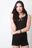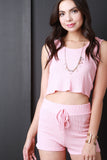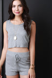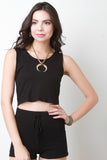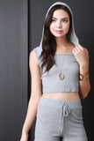 This top features a thermal knit fabrication, round neck with an attached hoodie, sleeveless construction, and cropped hemline. Accessories sold separately. Made in U.S.A. 95% Rayon, 5% Spandex.