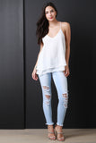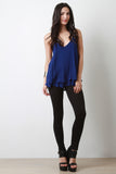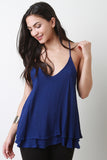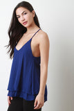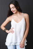 This cute sleeveless top features a strappy low cut back design, spaghetti straps, v neckline, flare cut, layers, self lined, light weight woven fabrication. Accessories sold separately. Made in U.S.A. 65% Rayon 35% Polyester.