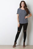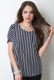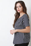 This short sleeve top features vertical stripe knit, round neckline, left breast pocket, and surplice open back. Accessories sold separately. 64% Rayon, 30% Polyester, 6% Spandex.