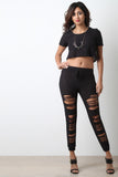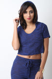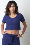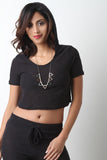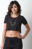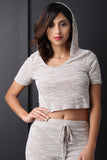 This top features a knitted fabric, back razor cut details, round neckline with attached back hoodie, and short sleeves fit. Finished with a cropped hemline. Accessories sold separately. Made in U.S.A. 87% Polyester, 10 % Rayon, 3% Spandex.