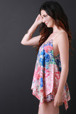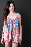 This gorgeous sleeveless top features floral print, geo pattern borders, deep v-neckline, adjustable spaghetti straps, and handkerchief hemline. Accessories sold separately. Shell: 100% Polyester.
