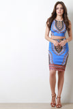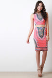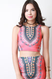 This crop top features smooth stretch fabric, African tribal print, round neckline, and sleeveless construction. Accessories sold separately. Made in USA. 92% Polyester, 8% Spandex.