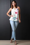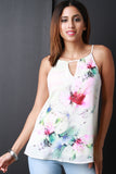 This lovely sleeveless top features pastel floral print, front cut out, back self-tie straps, and finished with lining. Accessories sold separately. Made in USA. 100% Polyester. Lining: 100% Polyester.
