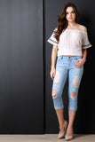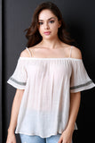 This casual top features a woven fabric, cold shoulder design, spaghetti straps, and off the shoulder short sleeves with embroidered pattern trim detail. Accessories sold separately. Made in U.S.A. 65% Rayon, 35% Polyester.