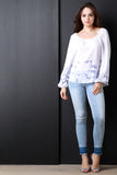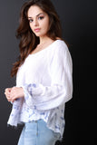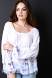 This simple top features a lightweight woven fabric, minimal tie dye print, longsleeves with elasticized ends, and boat neckline. Finished with a rounded raw hemline. Accessories sold separately. Made in U.S.A. 50% Rayon, 50% Cotton.