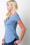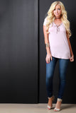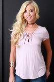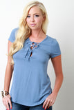 This basic top features a jersey knit fabrication, v-neckline with lace-up detail, shortsleeves construction, and rounded hemline. Accessories sold separately. Made in U.S.A. 92% Rayon, 8% Spandex.