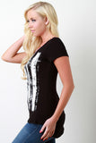 This prideful t-shirt features a jersey knit fabrication, American Flag graphic print with rustic style at front, constrasting stripes rounded neckline, and cap sleeves. Finished with a high-low hemline. Accessories sold separately. Made in U.S.A. 97% Rayon, 3% Spandex.