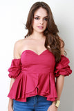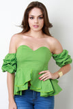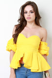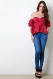 This stylish tube top features a crisp woven fabric, sweetheart neckline, elastic ruffled sleeves, and sweetheart neckline. Finished with a hidden rear zip-up fastener. Accessories sold separately. Made in U.S.A. 92% Cotton, 8% Spandex.