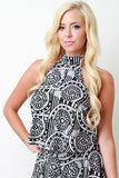 This cutesy crop top features a lightweight knit fabrication, monochromatic geometrical print pattern, choker banded halter neckline, and sleeveless fit. Finished with an open back and double button hook closure at nape. Accessories sold separately. Made in U.S.A. 70% Rayon, 30% Acetate.