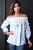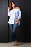 This trendy summer blouse features an off the shoulder neckline, smocking detail, long sleeves with self tie cuffs, lightweight woven fabrication, pinstripe print, a loose boxy fit, finished with a high low hem. Accessories sold separately. 60% Cotton 37% Nylon, 3% Spandex.