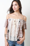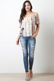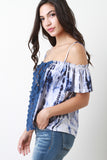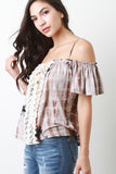 This soft knit top is flare cut, featuring spaghetti straps and elasticized cold shoulder sleeves. Front is detailed with a crochet open front, featuring a key hole and self tie bow-tie along the neckline. Accessories sold separately. 95% Rayon. 5% Spandex