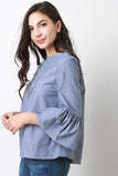 This top features chambray denim fabric, round neckline, and long bell sleeves. Accessories sold separately. Made in USA. 100% Cotton.