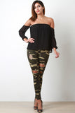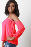 This bardot top features a semi-sheer chiffon fabrication, an elasticized off-the-shoulder neckline, long sleeves, and a flowy cut fit. Accessories sold separately. Made in U.S.A. 100% Polyester.