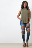 This top is relaxed fit with a sleeveless design with dropped armholes. Jewel neckline featuring a deep v open back. High low hemline is curved with slit sides. Soft knit, unlined. Accessories sold separately. 95% Rayon. 5% Spandex.