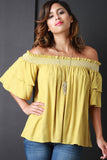 This bardot top features an elasticized smock off-the-shoulder neckline, double tier short flutter sleeves, and a relax cut fit. Accessories sold separately. 100% Rayon.