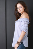 This top features off the shoulder ruffle neckline, half sleeves, and relaxed fit. Accessories sold separately. Made in USA. 100% Cotton.