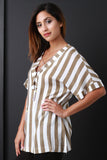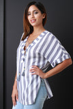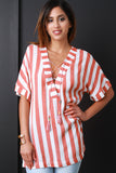 This breezy tunic style blouse features a pretty stripe prints, split v-neck with tassel lace-up closure, short cuff sleeves, double side slits, and boxy cut fit. Accessories sold separately. Made in U.S.A. 100% Rayon.