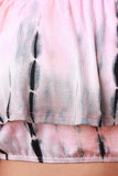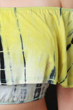 This crop top features an elasticized off-the-shoulder ruffled neckline, soft jersey knit with tie dye coloring, and a cropped hemline. Accessories sold separately. Made in U.S.A. 96% Rayon, 4% Spandex.