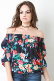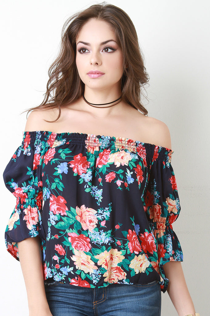 This bardot top features a smock off-the-shoulder neckline, quarter length puff ruffle sleeves, and floral print finish.Accessories sold separately. Made in U.S.A. 100% Polyester.