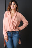This fashionable shirt features a v-neckline, notch collar design, overlapping front with buttons closure, long sleeves, and high low hem. Accessories sold separately. 100% Polyester.