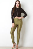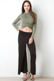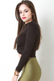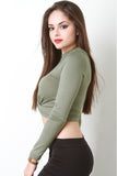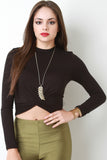 This crop top features a mock neckline, long sleeves , and a crossover constructed hemline. Accessory sold separately. Made in U.S.A. 95% Rayon, 5% Spandex.