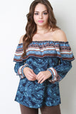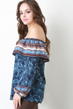 This top features an off the shoulder elasticized neckline with a ruffle and long sleeves. Flare cut, semi sheer, unlined. Mixed paisley print throughout. Accessories sold separately. 98% Polyester. 2% Spandex. Made in USA.