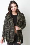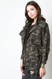 This jacket features a camouflage pattern, zip-up front, snap button closure, two breast pockets, and self-tie belt. Accessories sold separately. 100% Cotton.
