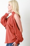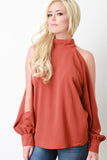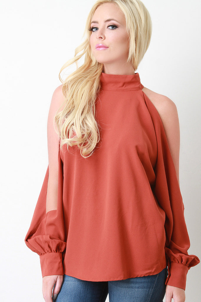 This top features mock neck, slit long sleeves, and finished with back zipper closure. Accessories sold separately. 97% Polyester, 3% Spandex.