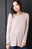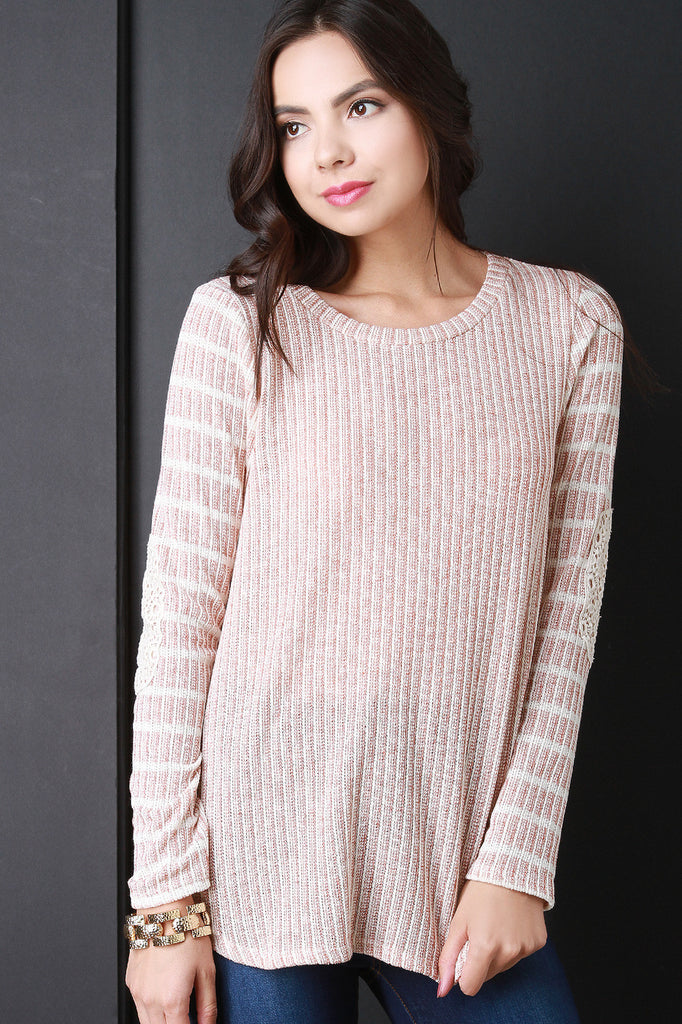 This beautiful top features a stripe ribbed knit fabrication, round neckline, long sleeves with crochet patch detail, and curved hemline. Accessories sold separately. Made in U.S.A. Self: 56% Polyester, 32% Cotton, 6% Rayon, 6% Spandex. Contrast: 58% Polyester, 32% Cotton, 4% Rayon, 6% Spandex.