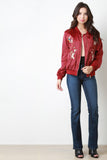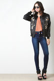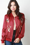This trendy bomber jacket features glossy charmeuse fabric, rib knit trim, zip-up front, floral embroidery, two pockets, and lining. Accessories sold separately. 100% Polyester.