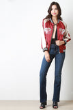 This bomber jacket features two tone glossy charmeuse fabric, striped rib knit trim, zip up front, embroidered koi fish, two pockets, and lining. Accessories sold separately. 100% Polyester.