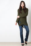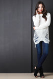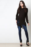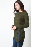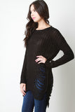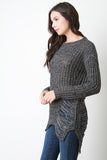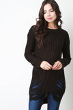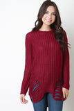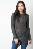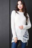 This sweater top features chunky loose knit, shredded accents, round neckline, long sleeves, and high-low hem. Accessories sold separately. 55% Cotton, 45% Acrylic.