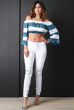 This crop top features a lightweight fabrication with stripe detail, elasticized off the shoulder neckline, bell sleeves design, and elasticized cropped hem. Made in USA. 100% Cotton.