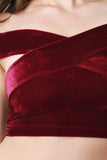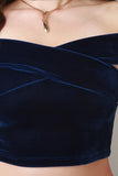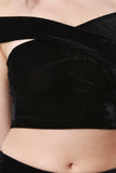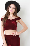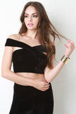 This sexy top features soft velvet fabric, criss cross off the shoulder neckline, and crop construction. Accessories sold separately. Made in USA. 92% Polyester, 8% Spandex.