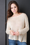 This cozy sweater features a loose chunky knit fabrication, rounded neckline, long sleeves, loose boxy fit, and dropped shoulder seams. Accessories sold separately. 100% Acrylic.