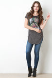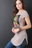 This trendy long tee features a soft marled knit fabric, reggae graphic print at front, contrast round neckline, and cap sleeves. Finished with a rounded hemline. Accessories sold separately. Made in U.S.A. 100% Polyester.