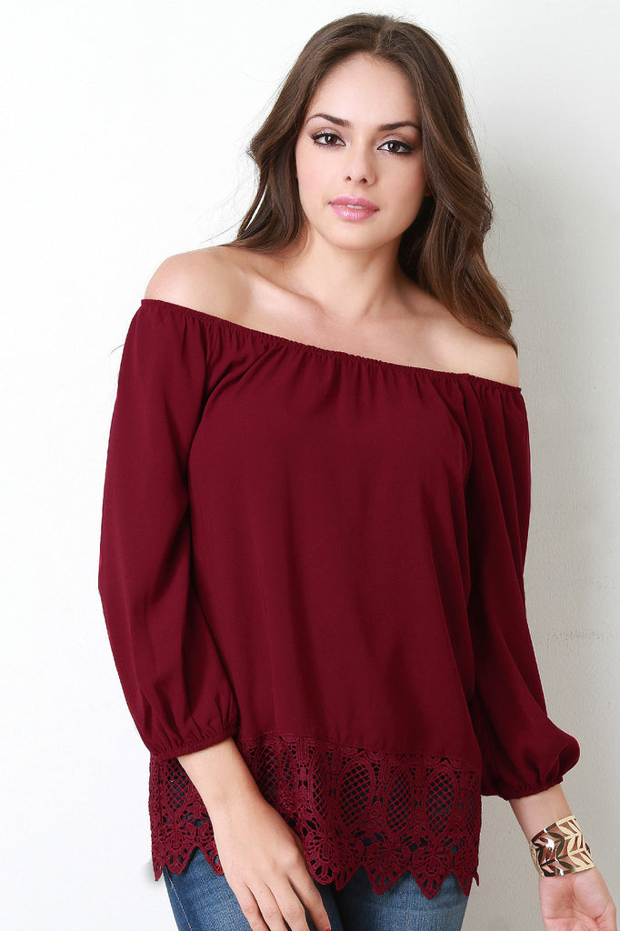 This trendy off the shoulder top features an elastic neckline, woven fabrication, long sleeves, elastic cuffs, and an ornate lace trim hem. Accessories sold separately. Made in U.S.A. 100% Polyester.