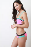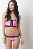 This bikini set features a top with color blocking detail, open back, non adjustable straps, hook and eye back, exposed zipper front. Bikini bottom features a low rise design, strappy sides, color blocking. Accessories sold separately. Made in U.S.A. 90% Polyester, 10% Spandex.
