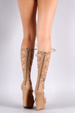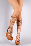 This eye-catching wedge features an open toe silhouette, strappy lace-up corset construction, and wrapped platform wedge heel. Finished with a lightly padded insole and back zip-up closure.